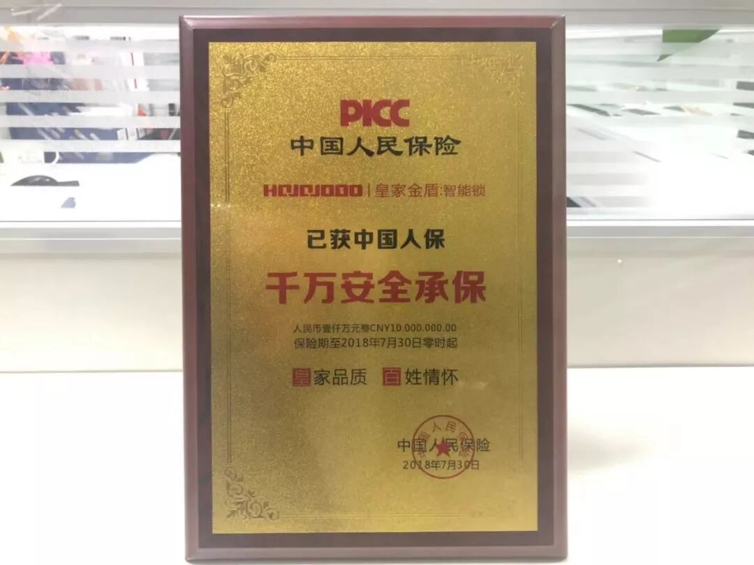 2018年,皇家金盾智能锁全系列产品由PICC中国人民保险公司承保,保额1000万,并额外给每户家庭免费赠送家财险一份。同时,我们向每一位消费者承诺:所有产品一年包换,十年保修。超长质保+严格品控+双保险,让您买的放心用的安心。
