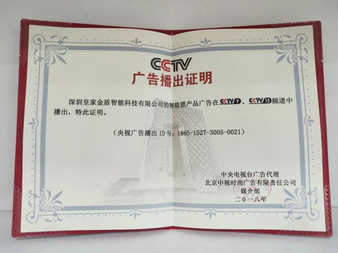 ▲皇家金盾智能锁CCTV央视广告播出证明